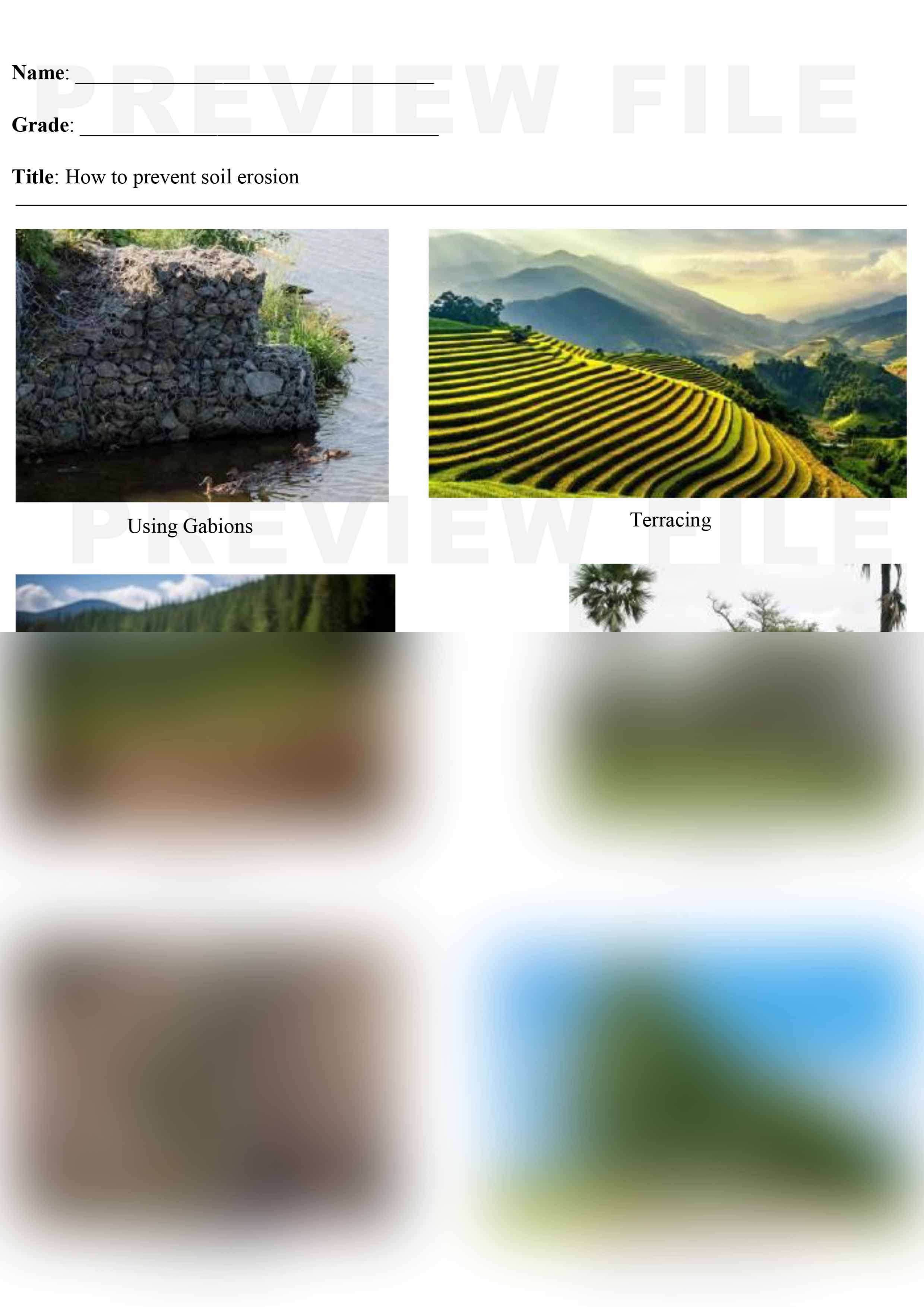 Complete File: Has 2 MS word files & 2 Print ready PDF files with a variety of pictures of How to prevent soil erosion