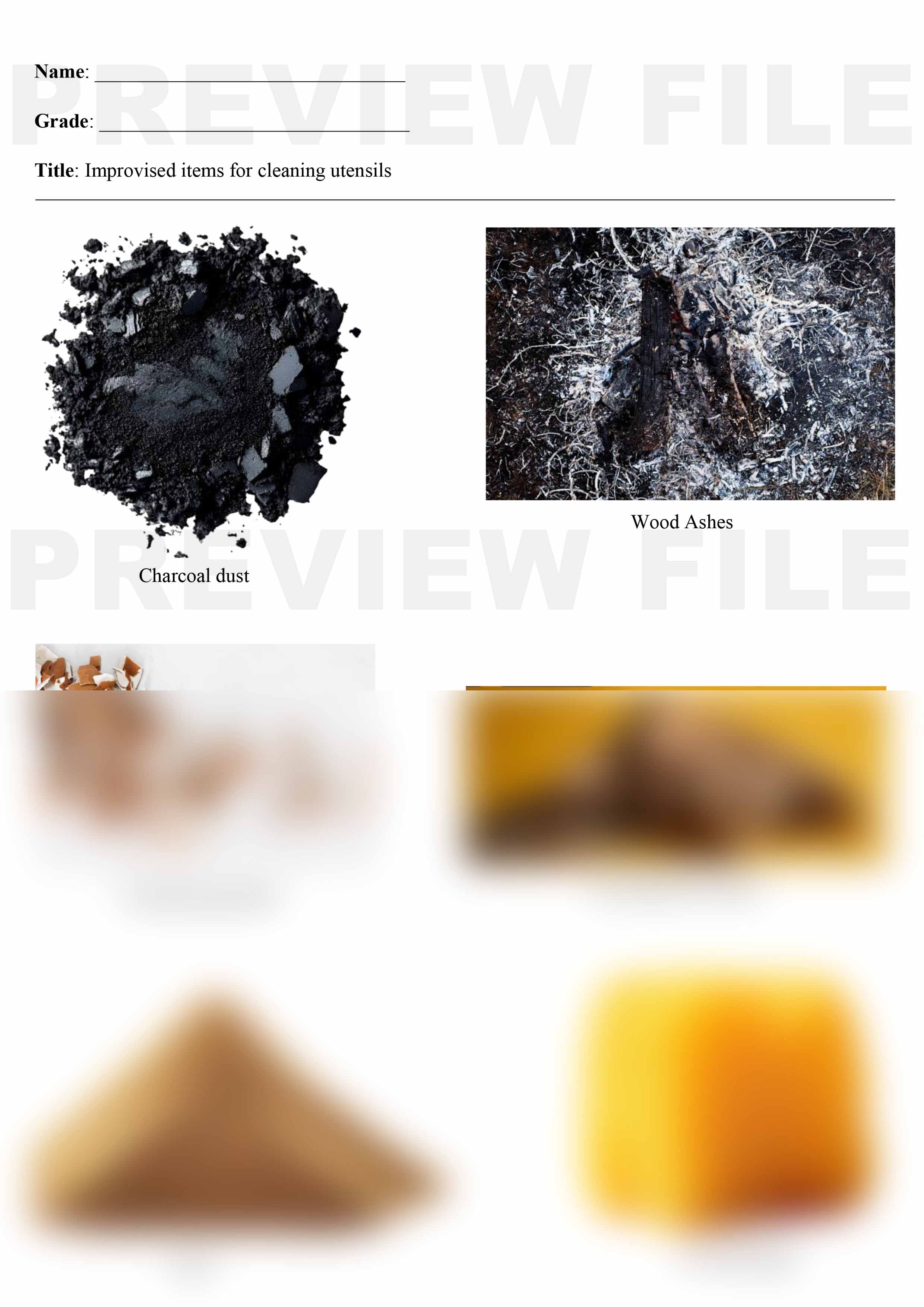 Improvised materials for washing utensils refer to alternative or locally available items used for cleaning dishes when conventional cleaning materials like dish soap, sponges, or scrubbers are unavailable. This file contains clear pictures of improvised materials like charcoal dust, wood ashes, crashed egg shells, e.t.c