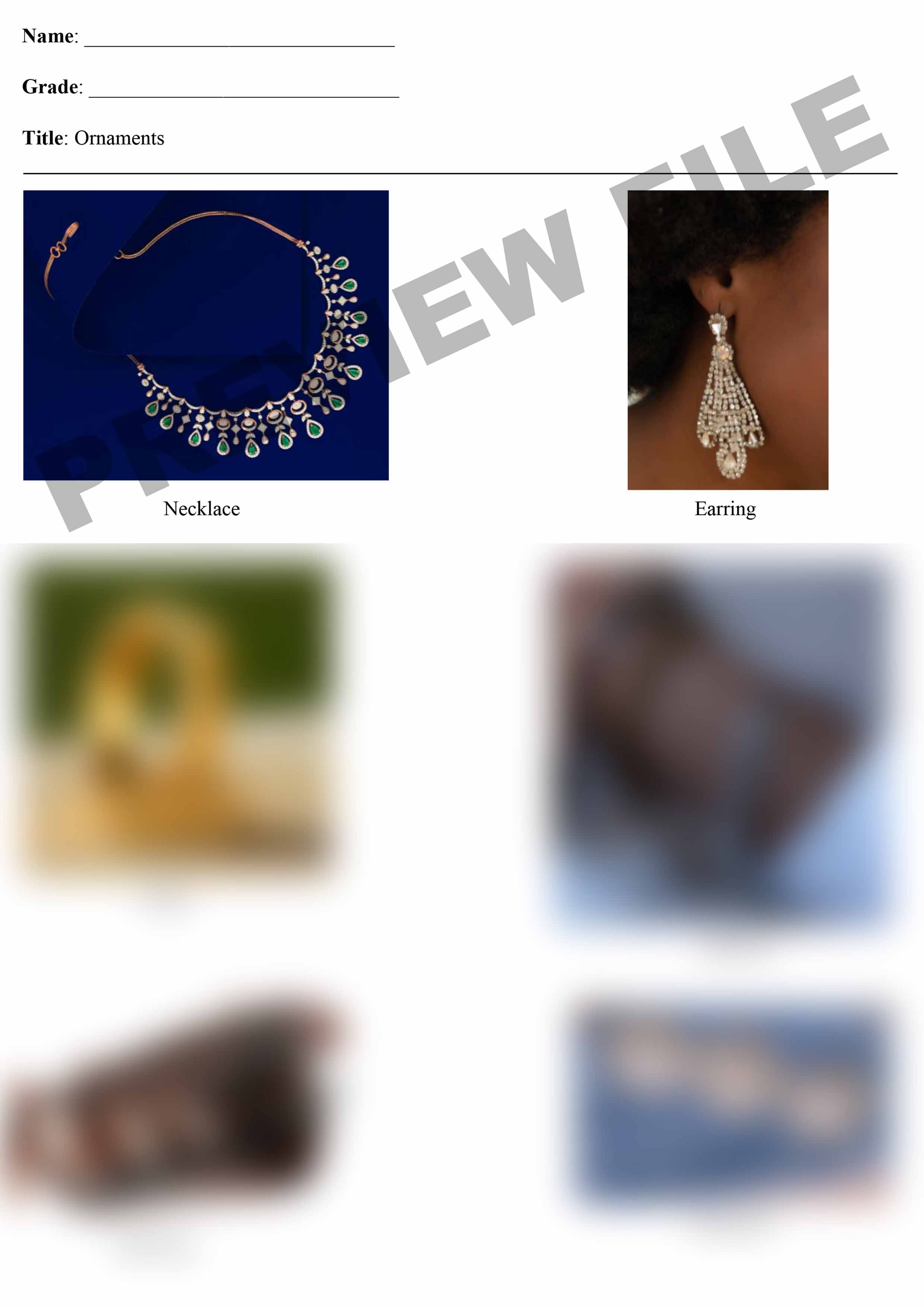 Ornaments are decorative objects or designs used to enhance the appearance of something or somebody. This file contains clear pictures of common ornaments like, Necklace, earrings, bracelet, e.t.c