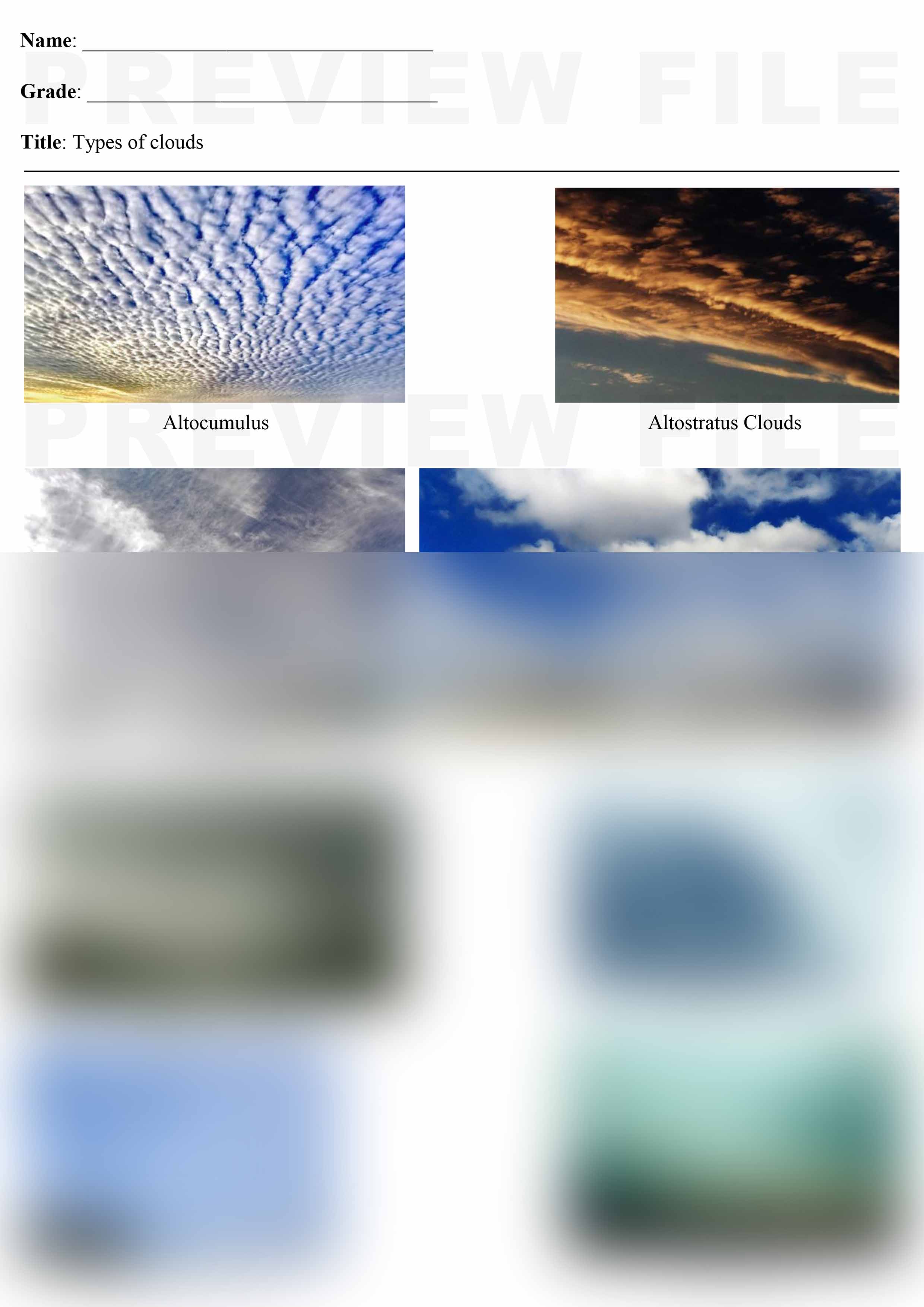 Complete File: Has 2 MS word files & 2 Print ready PDF files with a variety of pictures of Types of clouds