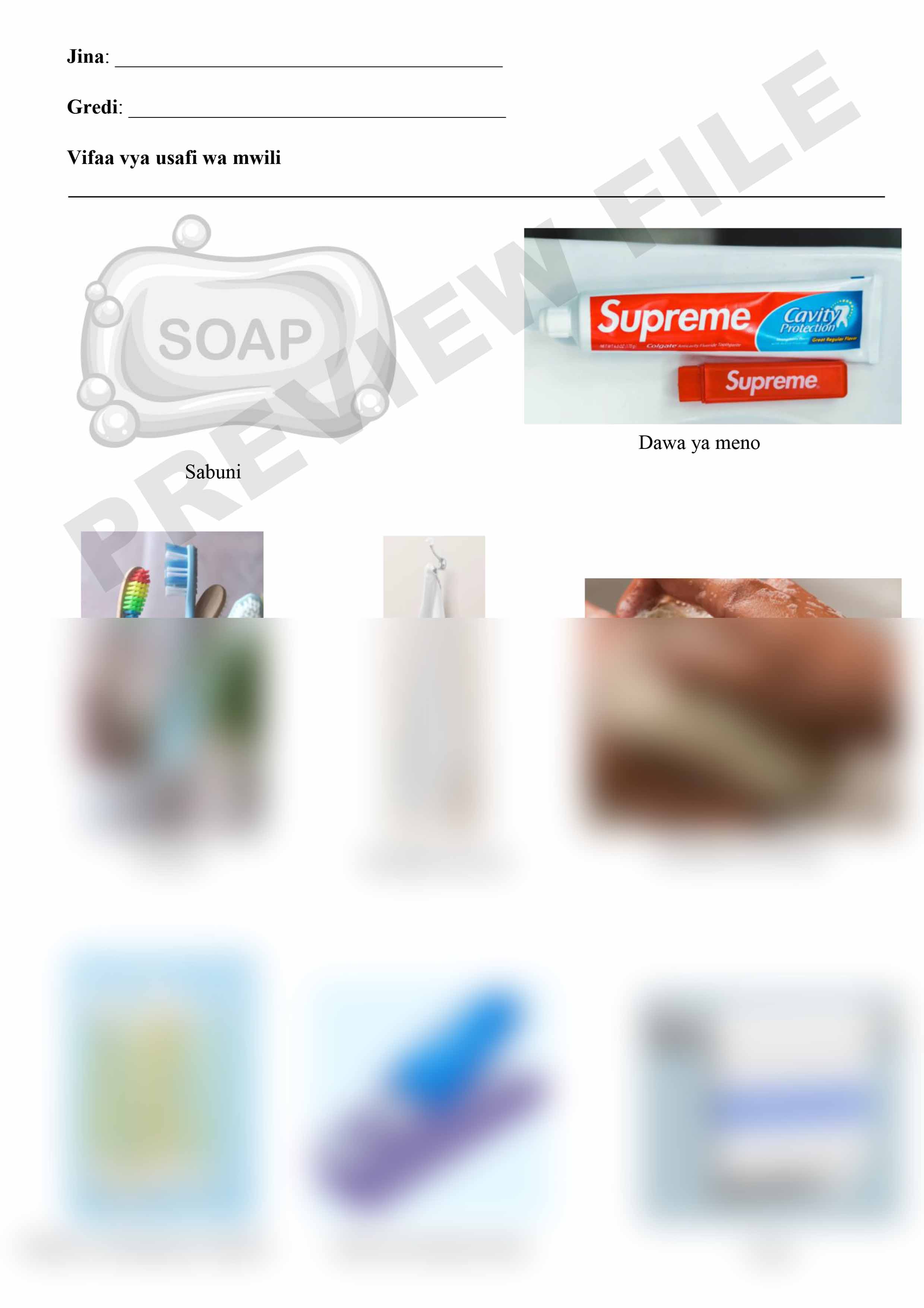 Kuna vitu vingi vinavyotumiwa kusafisha miili yetu, hutusaidia kukaa safi. Faili hii ina picha za vitu tofauti vinavyotumiwa kusafisha miili yetu kwa mfano, sabuni, dawa ya meno, taulo, na kadhalika.